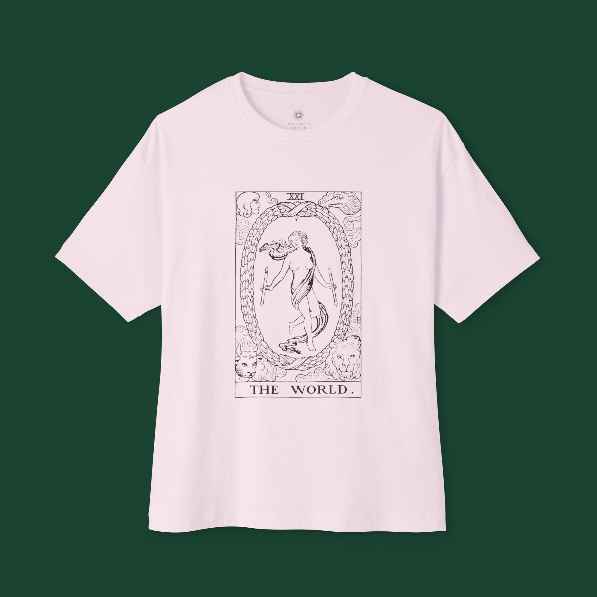Relaxed and oversized t-shirt featuring "The World" tarot card print on the front. Gives off a bohemian and spiritual vibe, perfect for those interested in tarot readings and astrology. Ideal for casual everyday wear or as a statement piece for spiritual gatherings or festivals.