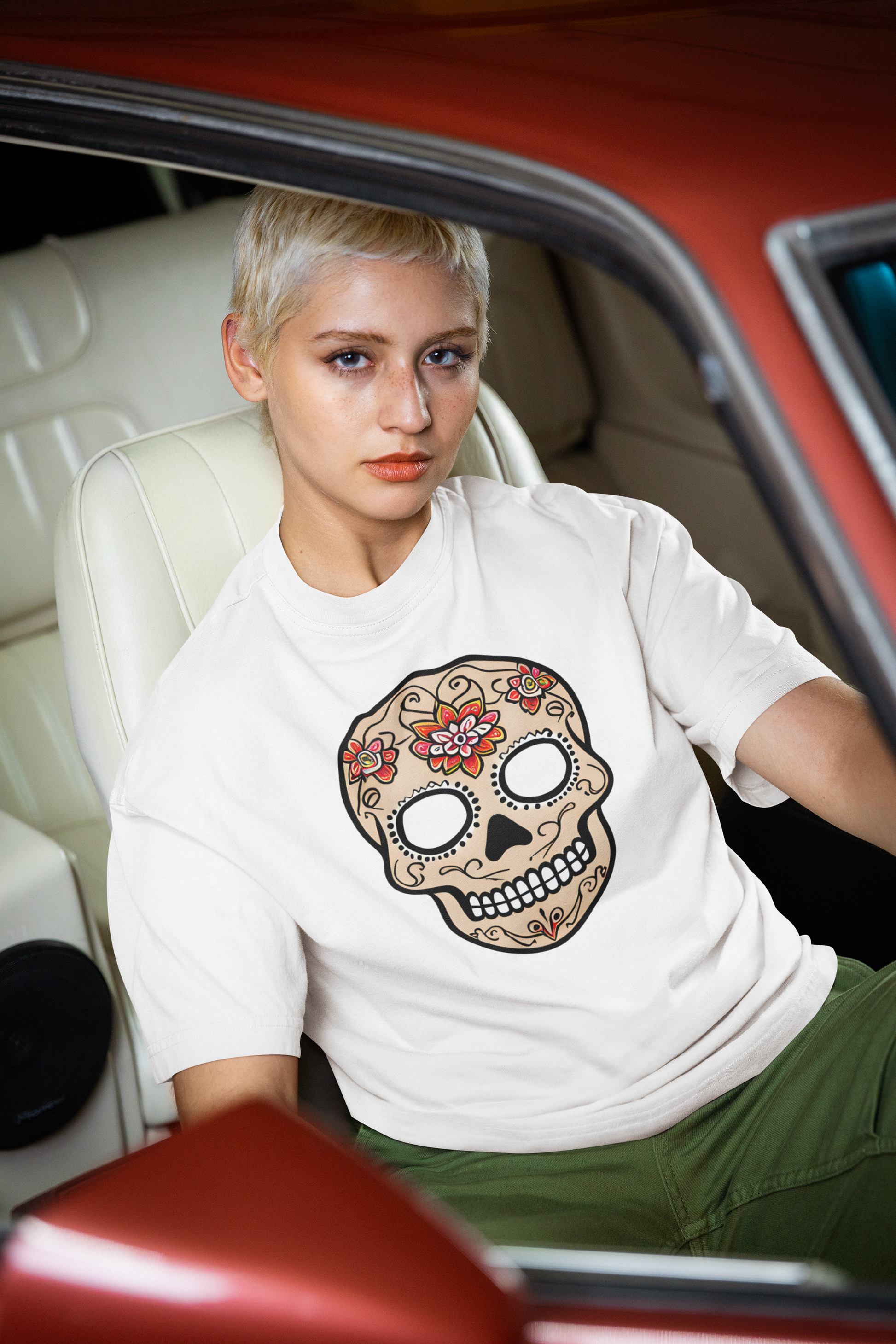 Relaxed and oversized t-shirt featuring "Dia de los Muertos" print on the front. Gives off a bohemian and spiritual vibe, perfect for those interested in spirituality and symbols. Ideal for casual everyday wear or as a statement piece for spiritual gatherings, festivals, halloween or day of the death.