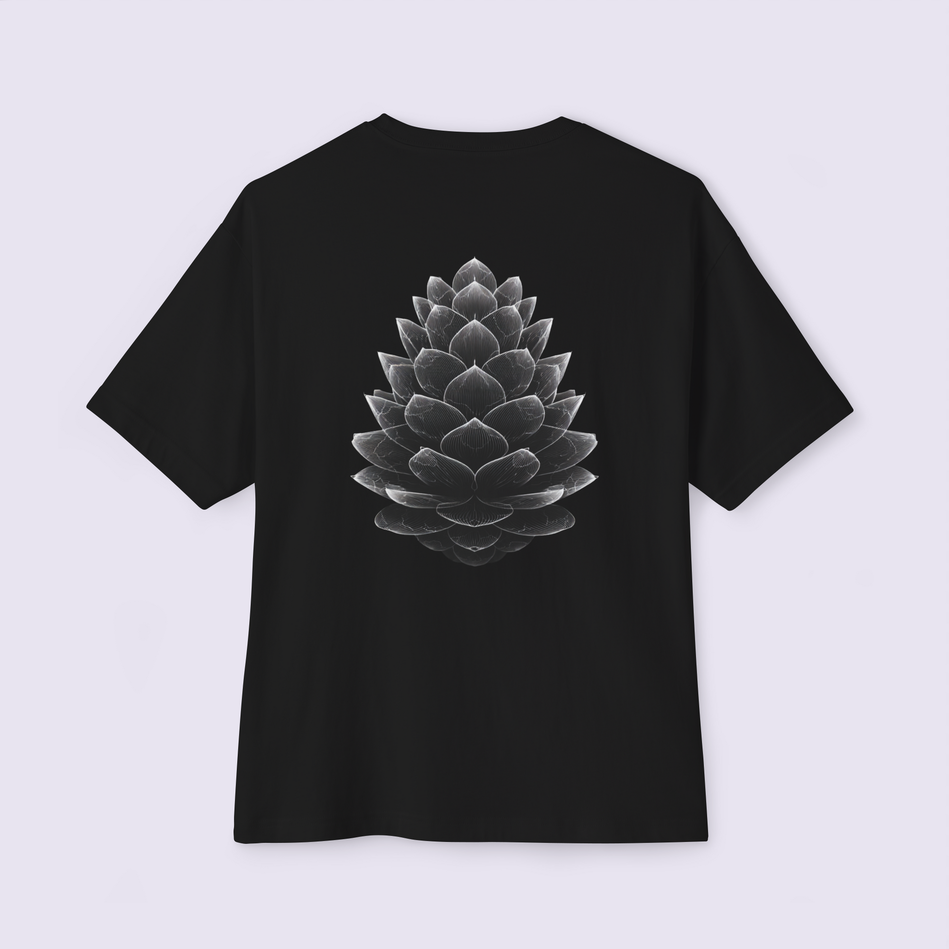 Relaxed and oversized t-shirt featuring a "Pine Cone" print on the back. Gives off a spiritual and sacred vibe, perfect for those interested in spirituality and old symbols. Ideal for casual everyday wear or as a statement piece for spiritual gatherings or festivals.