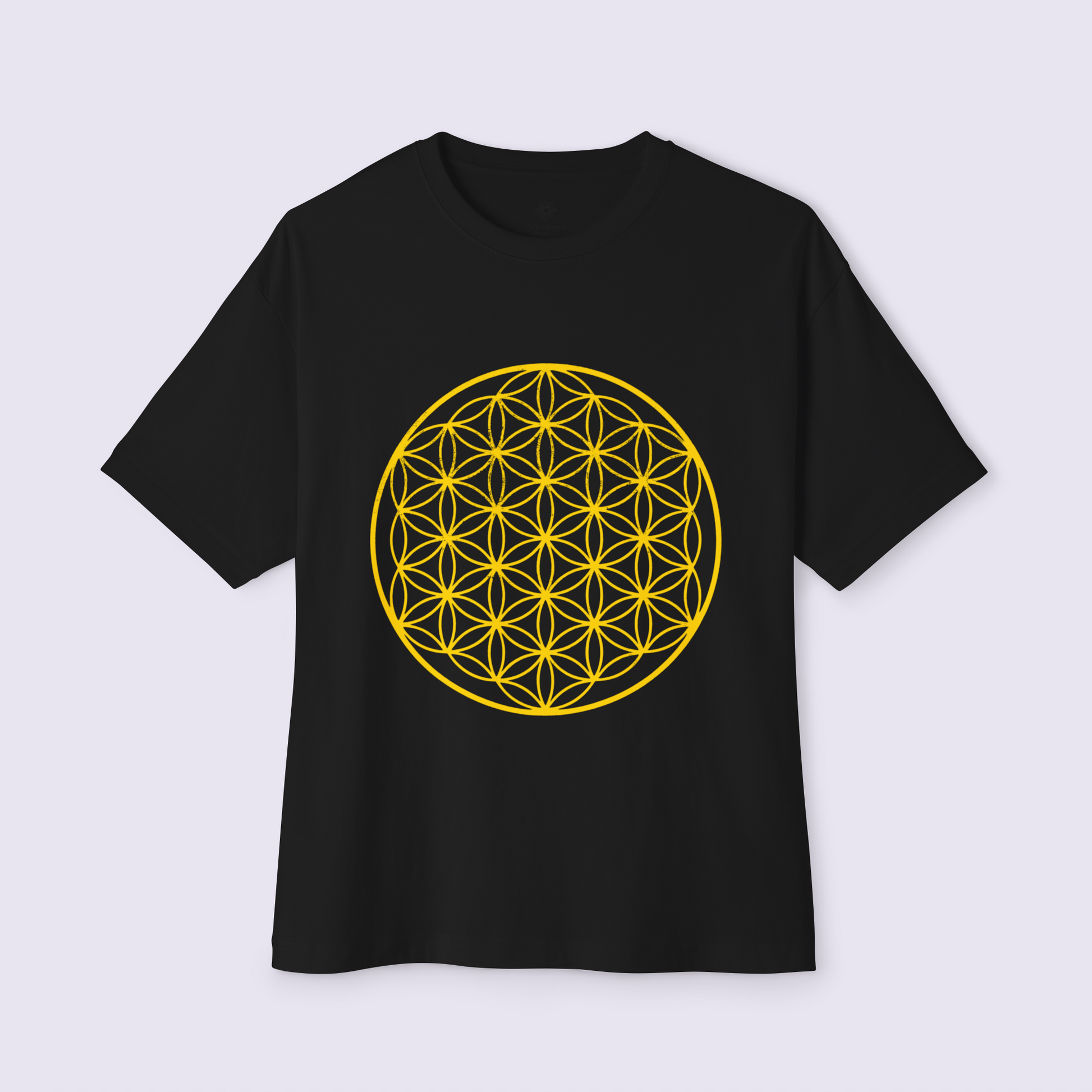 Relaxed and oversized t-shirt featuring "The Flower of Life" print on the front. Gives off a bohemian and spiritual vibe, perfect for those interested in spirituality and old sacred symbols. Ideal for casual everyday wear or as a statement piece for spiritual gatherings or festivals.